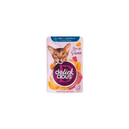 DELICKCIOUS CAT POUCHES 85GR DUCK&PUMPIK IN CREAM SOUP BBD 26/01/28 ( 1 X 12 )