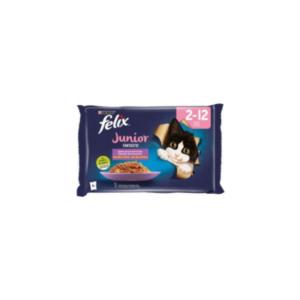 FELIX POUCHES 4X85GR FANTASTIC JUNIOR 2-12 MONTHS ( CHICKEN-SALMON-TUNA-BEEF) IN JELLY BBD 11/26 ( 1 X 12 )