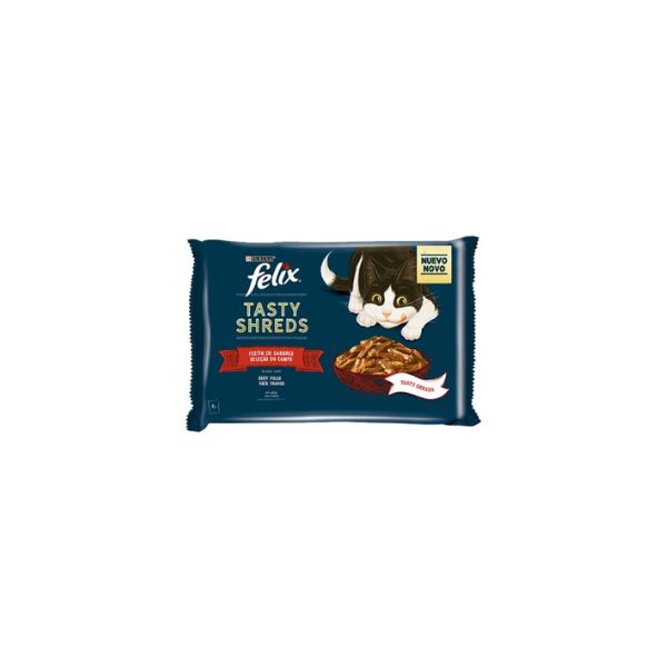 FELIX POUCHES 4X85GR TASTY SHREDS ( BEEF-CHICKEN-SALMON-TUNA ) IN SAUCE BBD 11/26 ( 1 X 12 )